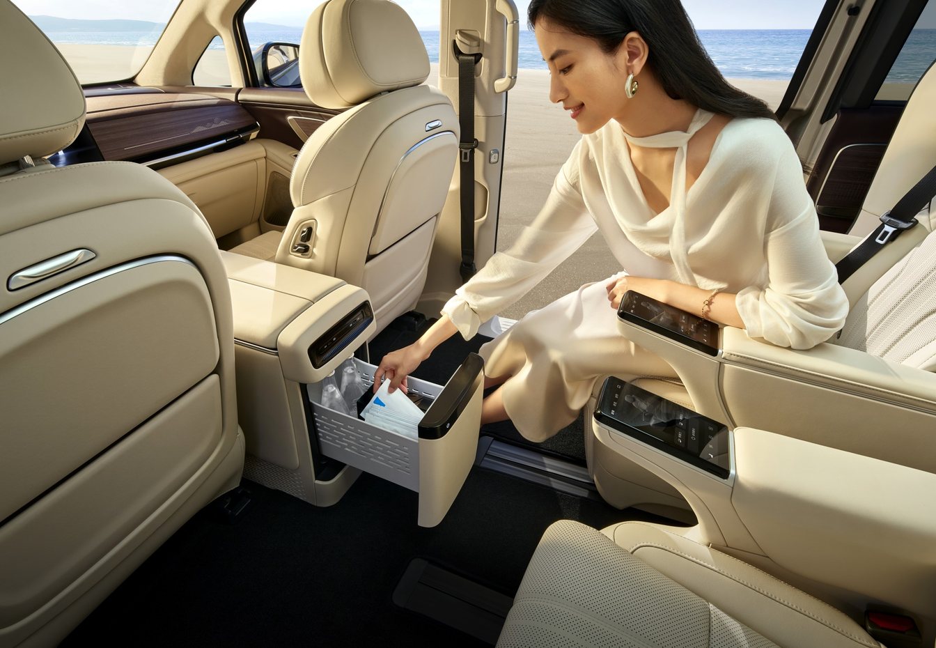 用户价值:商务接待时,二排乘客可享“零重力躺卧+加热按摩”;家庭出行时,第三排成年人也能“半躺休息”,冷暖箱同时容纳6瓶水+4盒冰淇淋,满足全家需求。