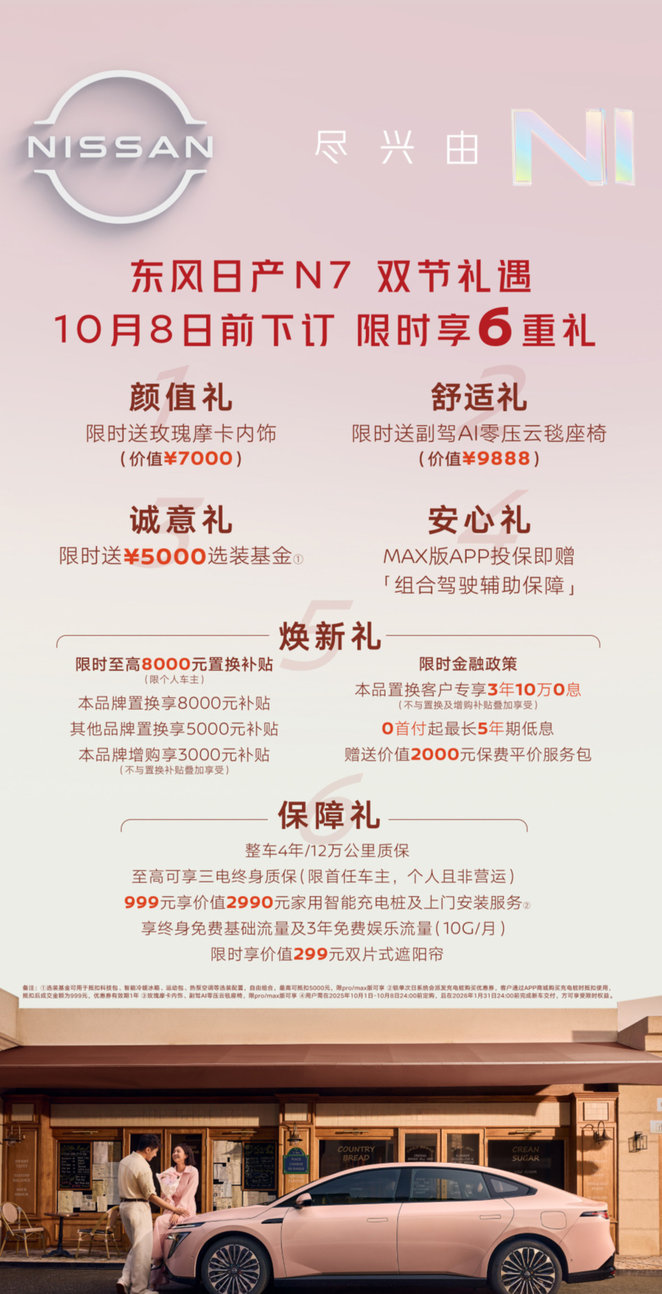 10月8日前,东风日产为选购N7的用户推出专属购车礼遇,涵盖配置升级、金融政策、用车保障等多重权益。