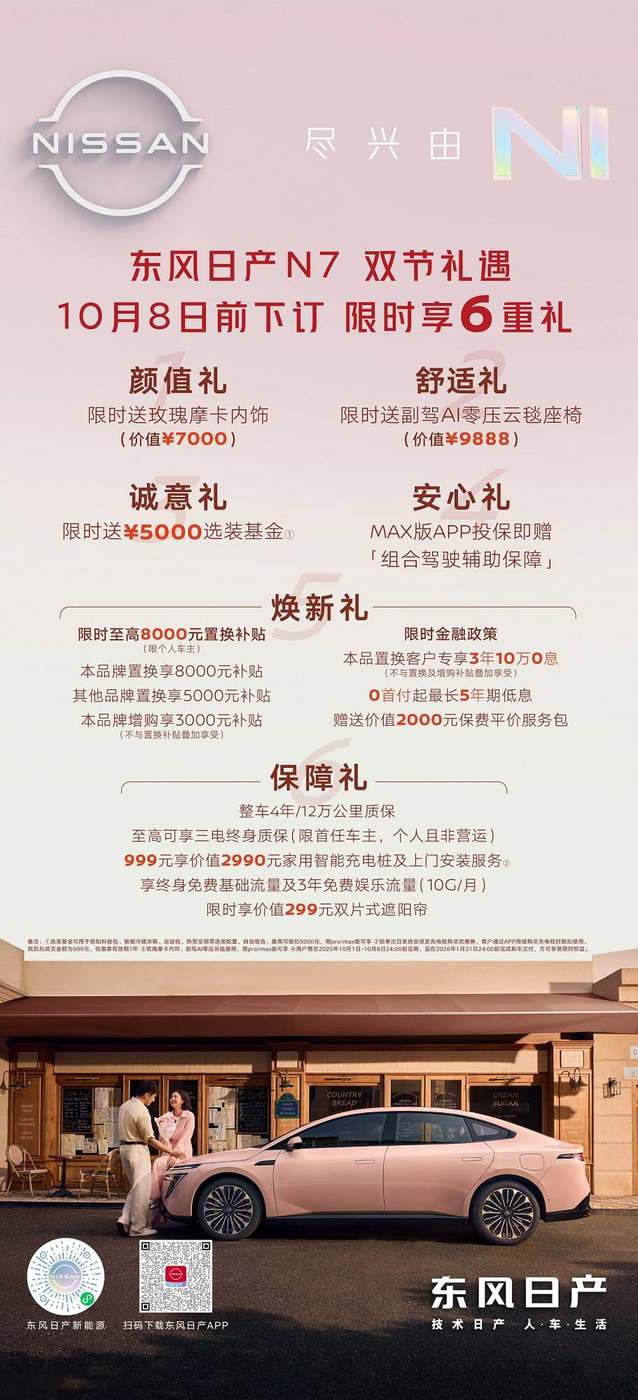 10月8日前,东风日产为选购N7的用户推出专属购车礼遇,涵盖配置升级、金融政策、用车保障等多重权益。