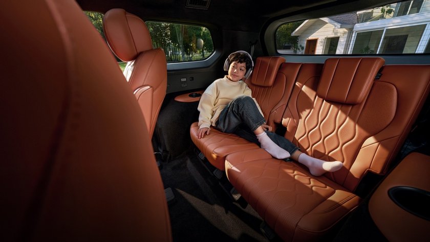 在一台车上,决定“空间感”的核心要素首先是轴距,轴距越长,就代表着这台车纵向空间越大。近年来,为了迎合多人口家庭需求,市面上涌现了很多轴距不足的7座车,第三排往往只能坐坐小孩或堆杂物,但星途揽月C-DM轴距足有2900mm,能够实现更均衡的前后排空间分配,其中三排腿部空间可达793mm,除了小孩,就算爸妈、亲戚朋友就算坐后排也不会觉得“施展不开”。