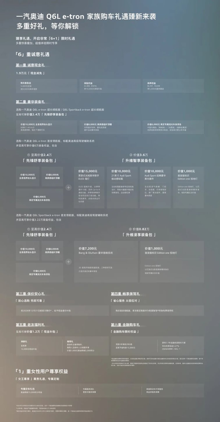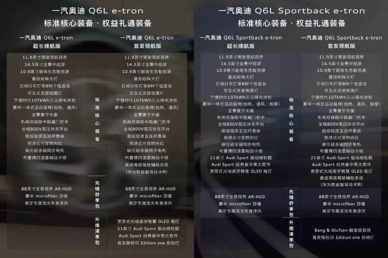 就拿前段时间上市的一汽奥迪Q6L e-tron家族来说,作为一台107度电的中型SUV,它的官方指导价是这样的: