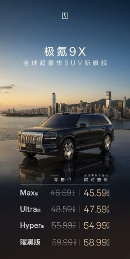 【2025年9月29日】今日,极氪旗下全球超豪华SUV新旗舰极氪9X正式上市,共推出Max版、Ultra版、Hyper版、曜黑版四个版型,官方零售价分别为46.59万元起、48.59万元起、55.99万元起、曜黑版59.99万元起,超级置换权益后限时售价分别为45.59万元起、47.59万元起、54.99万元起、58.99万元起。即日起,用户可通过极氪App、极氪官网、极氪小程序、全国各大城市的极氪门店等官方渠道进行预定。