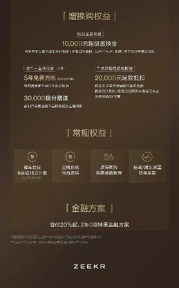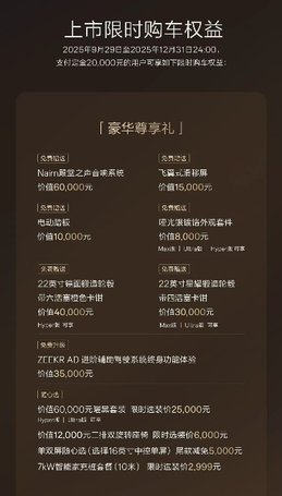 2025年9月29日至2025年12月31日,支付定金20,000元的用户,可享的限时购车权益,包括:免费赠送价值60,000元的Naim殿堂之声音响系统;免费赠送价值15,000元的飞翼式滑移屏;免费赠送价值10,000元的电动踏板;免费赠送价值8,000元的哑光银镀铬外观套件;免费赠送价值40,000元的22英寸镜面锻造轮毂带六活塞橙色卡钳(Hyper版可享);免费赠送价值30,000元的22英寸星耀锻造轮毂带四活塞卡钳(Max版和Ultra版可享);免费升级价值35,000元的ZEEKR AD 进阶辅助驾驶系统终身功能体验;价值60,000元的曜黑套装,限时选装价25,000元(Hyper版和Ultra版可享);价值12.000元的二排双旋转座椅,限时选装价6,000元;单双屏随心选(如选择16英寸中控单屏尾款可减免5,000元);7kW智能家充桩套餐(10米)限时选装价2,999元。同时,还提供10,000元超级置换金,用户可使用本人或亲友旧车行驶证(不限旧车品牌、公户/个人户)申请,用于订单尾款减免;极氪品牌新车首任车主增换购极氪9X,可享五年免费充电权益(每年1,000度),或吉利汽车集团旗下品牌现任车主增换购极氪9X,赠送30,000极分;搭载非千里浩瀚辅助驾驶系统的极氪001系列、极氪009系列车型首任车主,购买极氪9X可享20,000元尾款抵扣。