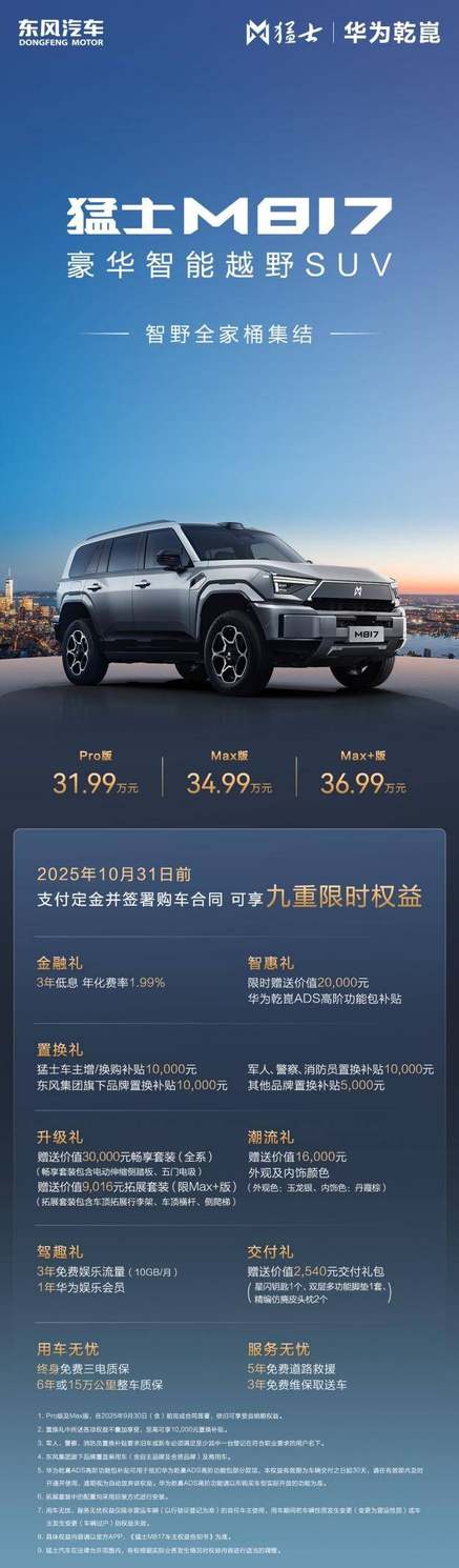补全长续航关键拼图,智能越野体验再升级!9月29日,东风猛士科技与华为联手打造的豪华智能越野SUV猛士M817长续航新成员——猛士M817 Max+版正式上市,官方指导价36.99万元,10月31日前支付定金并签署购车合同,可享九重限时权益,轻松开启全域智野新体验。