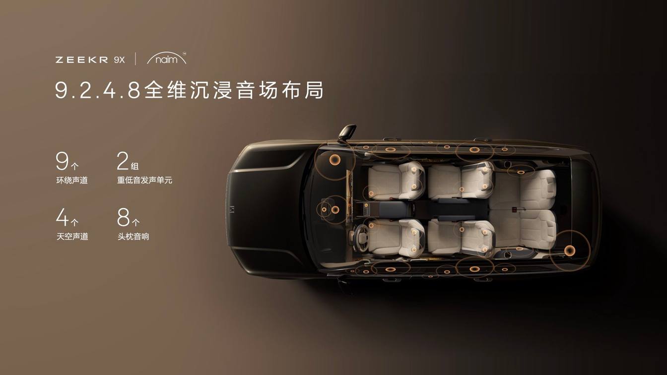 在极致的静谧表现之上,极氪与英国皇室御用音响品牌Naim深度合作,为极氪9X联手打造全球最大功率的车载音响。它拥有3868瓦的峰值功率,32个扬声器,支持杜比全景声,采用9个环绕声道、4个天空声道、8个头枕音响及2个低音炮,让每个座位都能享受殿堂级沉浸音效。
