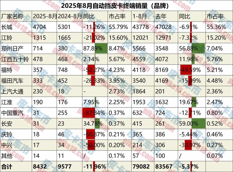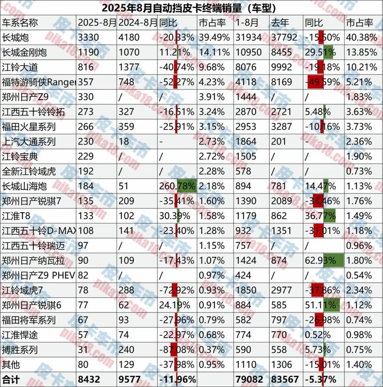 8月自动挡皮卡售8432辆,占比创新高至51.12%