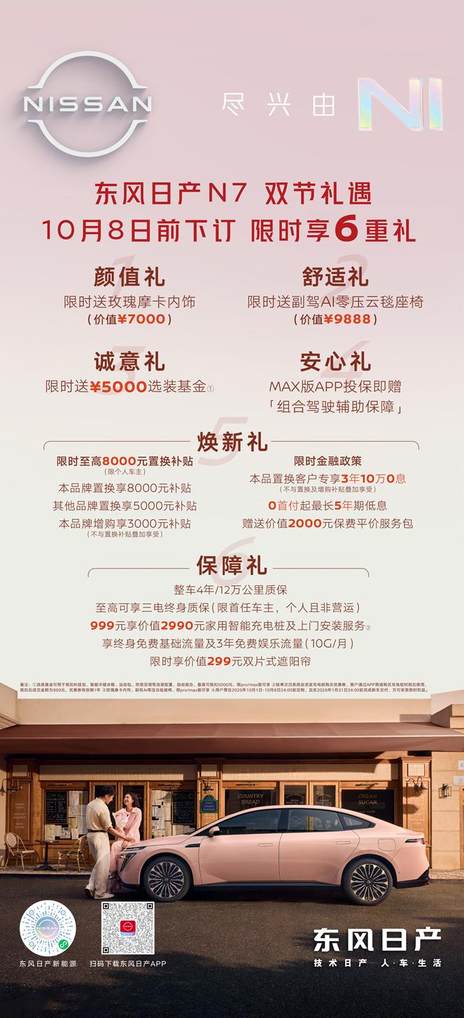 10月8日前,东风日产为选购N7的用户推出专属购车礼遇,涵盖配置升级、金融政策、用车保障等多重权益。