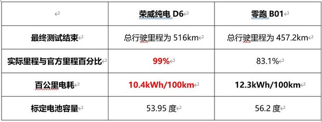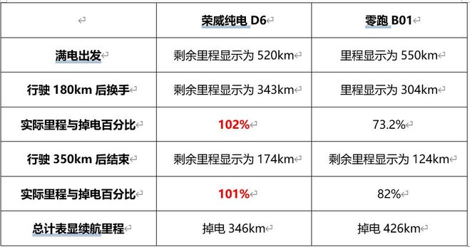 ②从最终行驶里程和表显里程的对比角度分析,我们可以看到,荣威纯电D6表现里程几乎和实际里程一致,而零跑B01的表显会有一定的“虚值”。