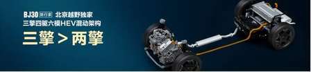 三擎混动,节能宗师!BJ30旅行家要做最省的轻越野旅行SUV,采用北京越野独家研发的“三擎四驱六模HEV混动架构”,百公里综合油耗低至5.85L,具备纯电、串联、并联、直驱、能量回收、驻车充电六大动力模式,系统会根据车速、路况、油门深度等参数,在各种模式间智能切换;搭载混动专用发动机,是保时捷同款黑科技,热效率高达41%。