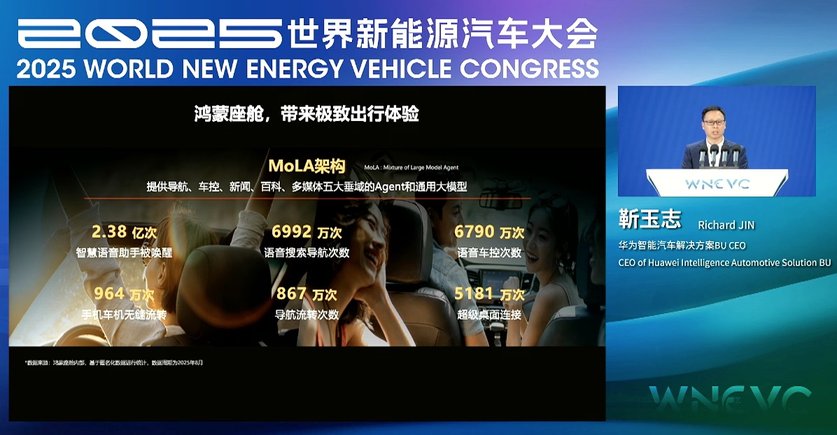鸿蒙座舱,搭载全新MoLA架构,将通用大模型的能力与音乐、影视等领域的AI能力进行整合,让导航更精准、车控更自然、资讯更生动、问答更贴心,观影更沉浸。截至2025年8月,智慧语音助手被唤醒2.38 亿次、语音搜索导航次数6992 万次、语音车控次数6790 万次、手机车机无缝流转964 万次、导航流转867 万次、超级桌面连接5181 万次。