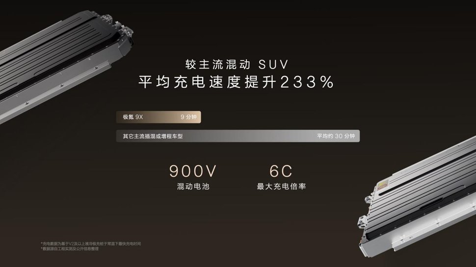 全系900V高压架构,配备55度和70度电池,纯电续航分别达300公里和380公里,均支持6C超快充,20%-80%充电仅需9分钟。对比市场上的插混SUV,这个纯电里程和充电速度都处于碾压级。