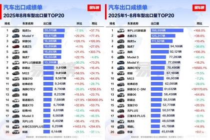从单月数据来看,8月比亚迪乘用车出口量达79603 辆,环比增长1.6%,这一成绩使其在当月生产厂商出口榜中仅次于奇瑞汽车(126738辆),且大幅领先于排名第三的上汽乘用车(41791 辆)。值得关注的是,比亚迪154.5%的同比增速,远超奇瑞的30.0%、上汽乘用车的11.5%等同行水平,在出口量TOP20厂商中增速排名第一,展现出极强的增长动能。