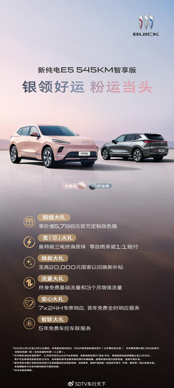 2025年9月30日 正值国庆、中秋双节来临,别克品牌推出购车重磅福利:购买别克纯电E5先享版,可在14.99万元一口价基础上,叠加至高“15 倍超级膨胀金”限时福利——1,000元定金抵扣15,000元,实际入手价低至13.59万元,让消费者用紧凑型纯电车的预算就能拥有中大型SUV越级体验;同时选购别克纯电E5智享版,可限时免费获赠售价5,798元的“好运银”或“桃喜粉”限量版炫色车衣,兼顾个性化审美与美好寓意*。此外,所有版本均享受奥特能三电系统终身质保、零自燃承诺1:1赔付、5年免费车控车联服务等安心保障,还可叠加至高2万元置换补贴。别克纯电E5真正从用户核心需求出发,以实打实的权益降低购车与用车成本,为消费者提供高品质纯电出行解决方案。