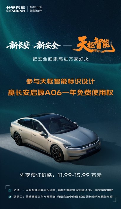 9月28日,长安启源A06先享预订发布会正式举行。发布会伊始,长安汽车执行副总裁杨大勇现场向用户送上“新长安·新安全——天枢智能”品牌标识设计征集和上车方案票选双重福利活动,点燃全场热情。活动一:天枢智能品牌标识征集,有机会赢得长安启源 A06一年使用权。活动二:天枢智能上车方案票选,有机会抽中价值 600 元长安汽车精美车模。