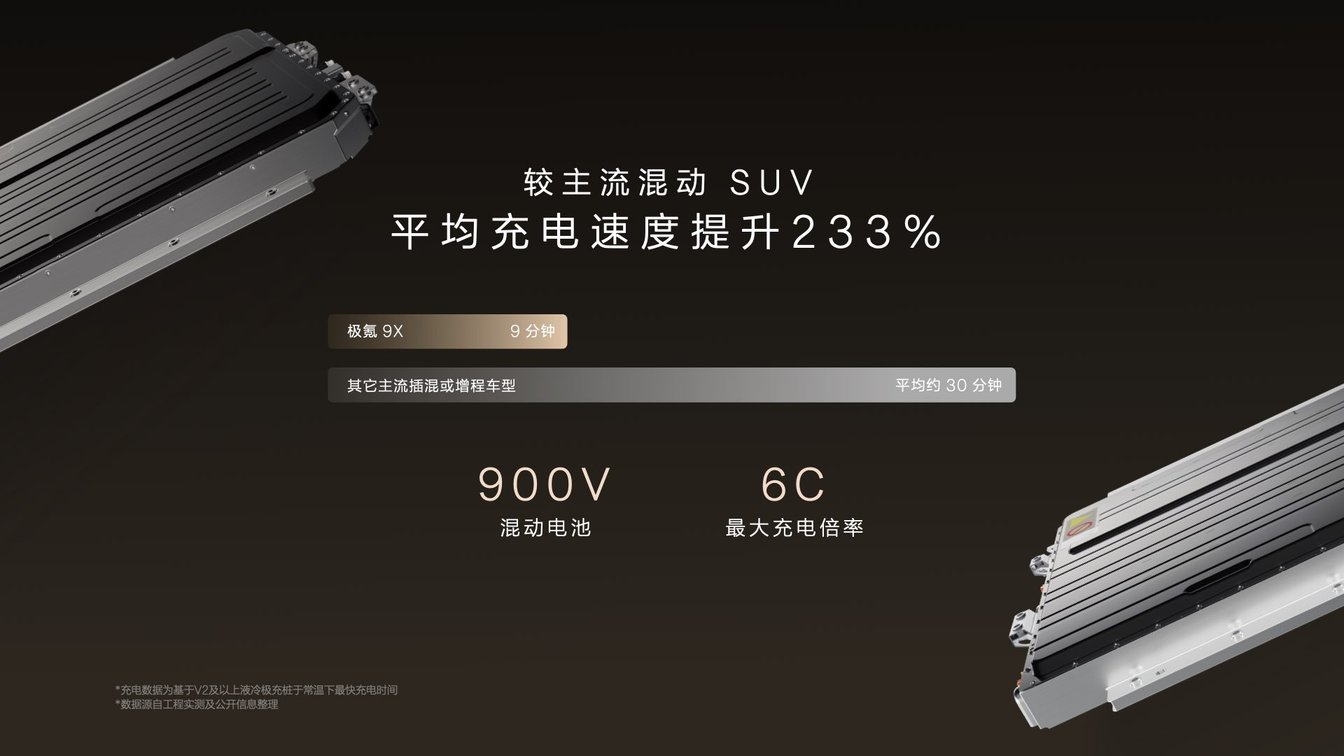 极氪9X全系采用与宁德时代联合开发的900伏混动专用电池,提供两种大电池方案。全球混动领域容量最高的70度大电池,纯电续航里程达到380公里,全球插混产品中纯电续航最高;起步版本也是同级最大55度电池,CLTC纯电续航300公里。两种电池方案均支持6C超快充,从20%充至80%仅需9分钟,领先所有混动产品和99%的纯电车型。