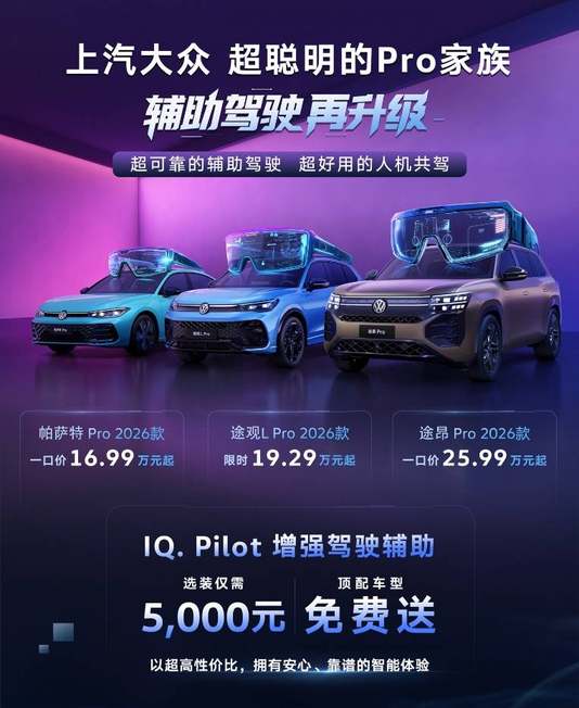 近年来,上汽大众始终秉承“油电同进,油电同智”战略,坚持燃油、新能源协同发展,覆盖用户的全场景需求。Pro家族2026款的上市与升级,为燃油车用户提供了遵循严苛安全品质、又深度适应中国市场的辅助驾驶与智舱解决方案,实现了“油电平权”的体验跨越。未来,上汽大众将持续推动燃油与新能源双轨并进,以更丰富的产品矩阵、更智慧的科技体验,陪伴每一位用户轻松出发、安心共驾,成就人车和谐共处的崭新未来。