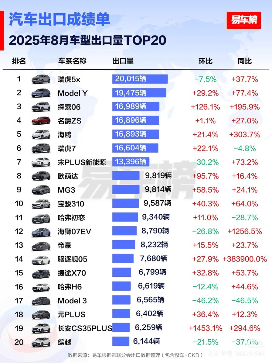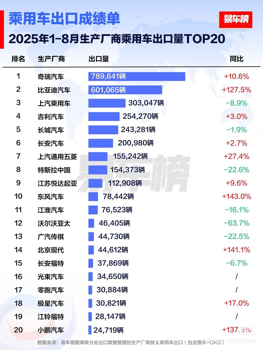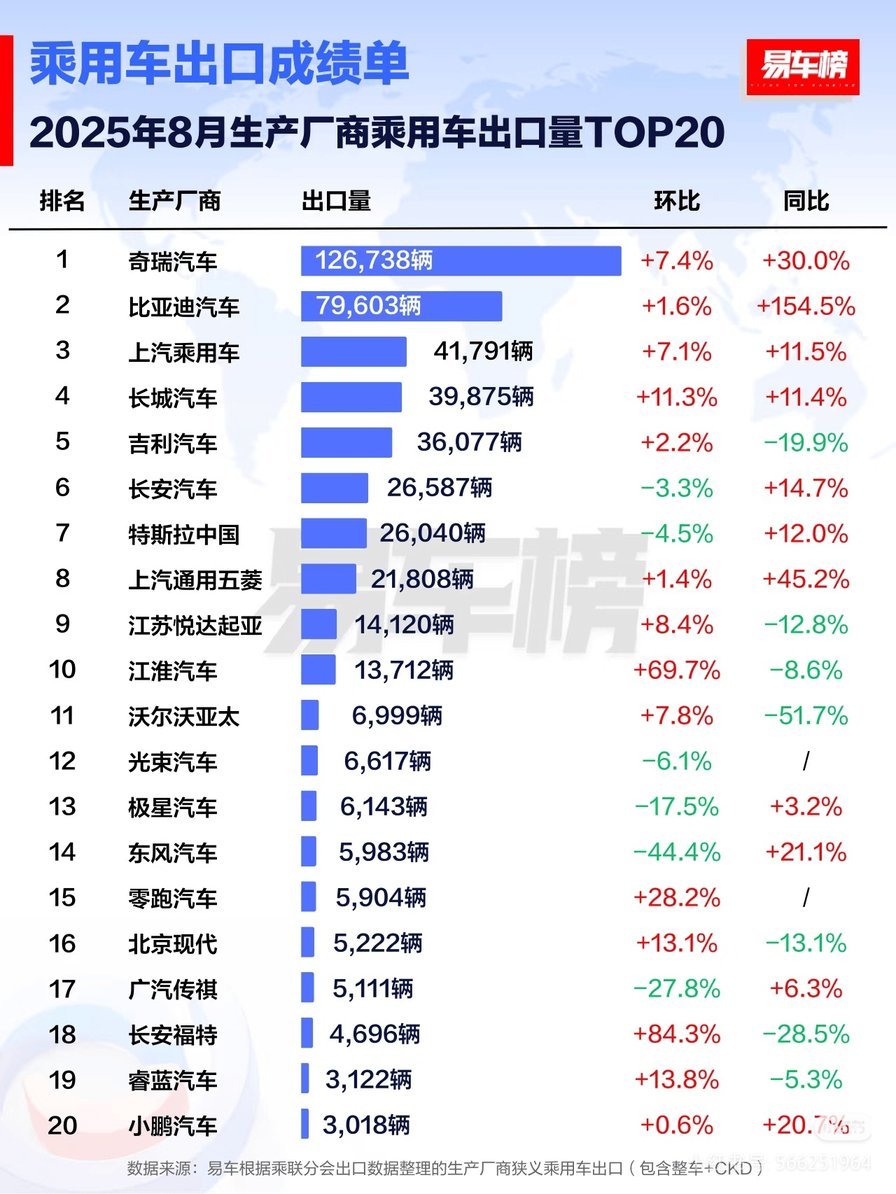 根据权威汽车媒体易车整理的出口数据:8月,比亚迪在生产厂商乘用车出口量排名中以79603辆的成绩位列第二,同比增长154.5%,增速排名第一。今年1-8月,比亚迪汽车累计出口量达601065辆,其中明星车型宋PLUS新能源销量达166699辆,摘得车型出口榜冠军,在国际市场的竞争力不断增加。