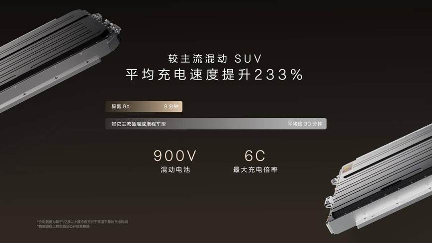 极氪9X全系采用与宁德时代联合开发的900伏混动专用电池,提供两种大电池方案。全球混动领域容量最高的70度大电池,纯电续航里程达到380公里;起步版本55度电池,CLTC纯电续航300公里。两种电池方案均支持6C超快充,从20%充至80%仅需9分钟。