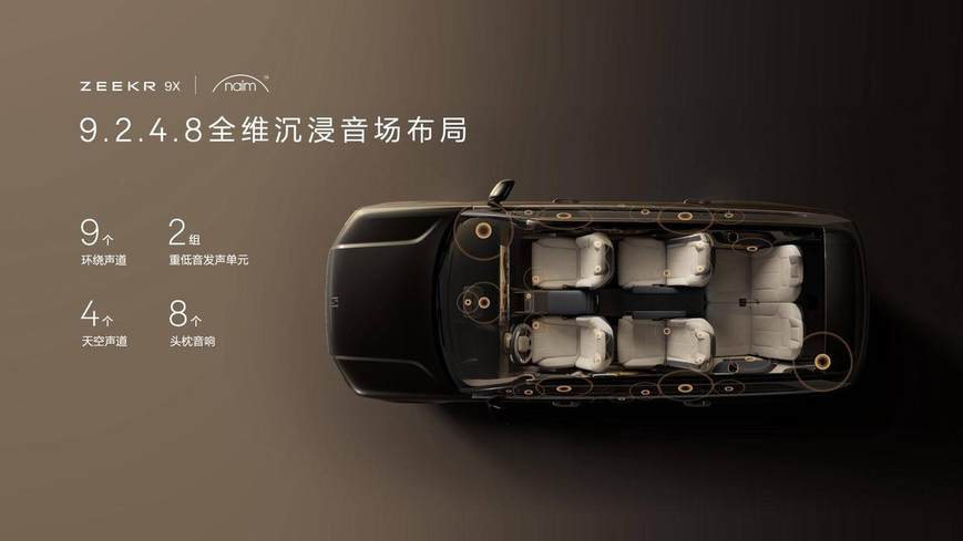 在极致的静谧表现之上,极氪与英国皇室御用音响品牌Naim深度合作,极氪9X拥有3868瓦的峰值功率,32个扬声器,支持杜比全景声,采用9个环绕声道、4个天空声道、8个头枕音响及2个低音炮,让每个座位都能享受殿堂级沉浸音效。