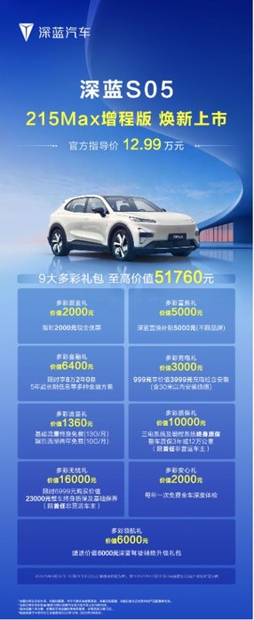 深蓝S05 215km增程版的登场,精准回应了用户对于续航、能耗、动力、超充以及整车综合体验的升级需求,巩固了深蓝S05作为15万内SUV出行标杆的行业地位。焕新进阶的深蓝S05全系产品,既是新央企新深蓝诚意满满的力作,也是深蓝汽车用技术实力赋能用户体验的集中体现。深蓝S05将以全方位的体验升级和安全满满的出行保障,为你的每一次出发注入安心与愉悦,将高品质的出行体验带入万千家庭。