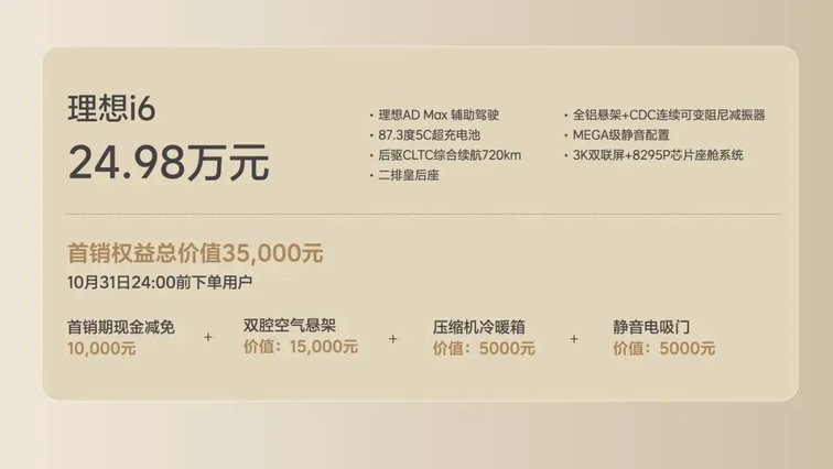 当天,李想宣布,这款承袭了理想MEGA和理想i8设计理念的全新纯电SUV车型,全系仅一个配置,售价24.98万元起,同时10月底之前下单可减免1万元现金,并额外享受2.5万元的限时首销权益,包括价值1.5万元的双腔魔毯空气悬架、价值5000元的智能冷暖双用冰箱、价值5000元的全车静音电吸门。