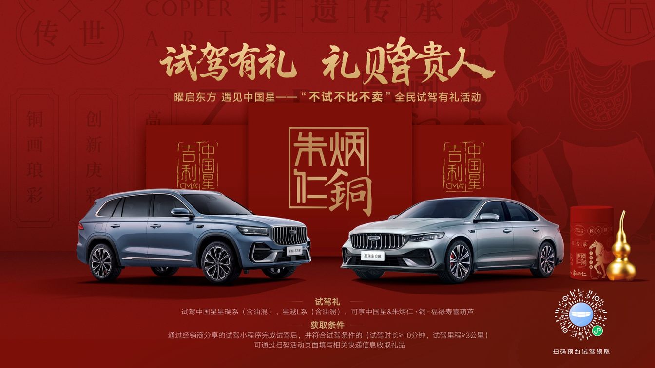 即日起至12月31日,针对购买中国星星瑞全系、星越L全系用户,每月将在第三方检测机构的监督与公证下,抽取300名幸运用户免费赠送中国星东方曜限量定制款MEIZU 22手机。此外,吉利中国星还携手中国非遗铜雕文创品牌——朱炳仁·铜,发起“试驾有礼,礼赠贵人” 不试不比不卖全民试驾有礼活动,到店试驾中国星星瑞、星越L系列车型,即可获赠由“朱炳仁·铜”匠心打造的【福禄寿喜葫芦挂件】一份。