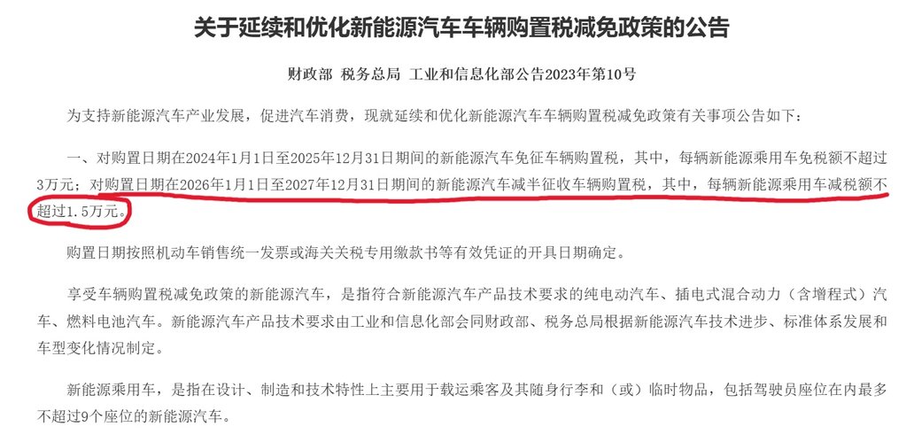 同样的如果你还是买一台33.9万元的新能源车,那么这个时候就不能全免3万元的购置税了,而是减半征收购置税,能给你减少1.5万元,所以你还需要交1.5万元的购置税,这相比起2026年1月1日之前买车来说,要多交1.5万元。