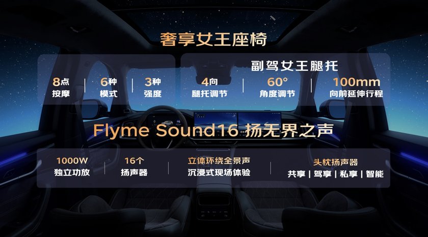 值得一提的是,星越L全新东方曜的“奢享女王副驾”给大L当场种草:8点按摩、6种模式、3种强度,腿托能向前延伸100㎜,靠背还能60°电动调节,轻松实现零重力躺姿。后排也一样舒适,支持30°-40°电动无级调节,一键到位。再加上Flyme Sound 16扬无界之声、256色氛围灯、车载香氛……这哪是开车,是把松弛buff拉满。