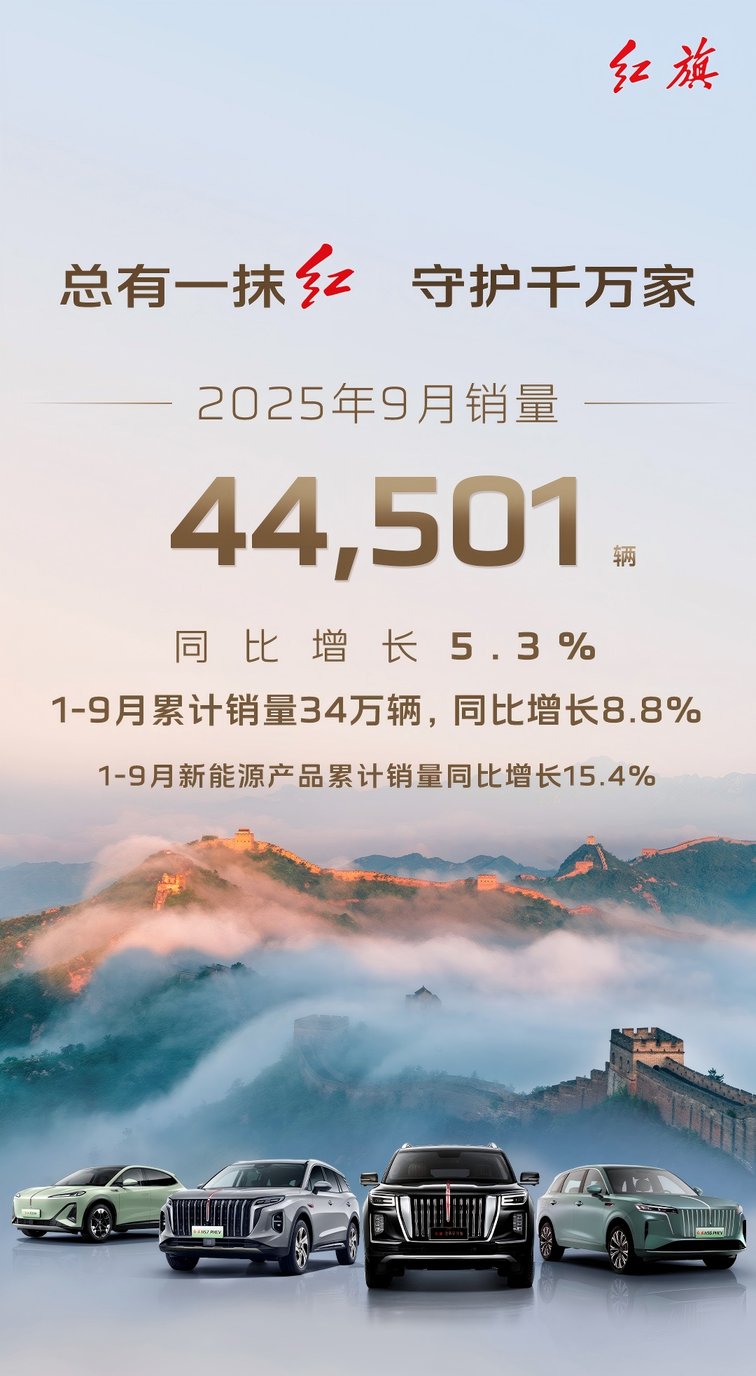总有一抹红,守护千万家。2025年10月1日,红旗品牌发布最新销量成绩:9月份,红旗品牌单月销量突破4.45万辆,同比增长5.3%,1-9月累计销量34万辆,同比增长8.8%,持续巩固自主豪华品牌领跑地位。其中,红旗新能源产品1-9月累计销量同比增长15.4%,持续担当销量增长核心动能。红旗金葵花产品1-9月累计销量同比增长28.3%,持续在超豪华市场打造具有东方神韵的顶级豪华体验。