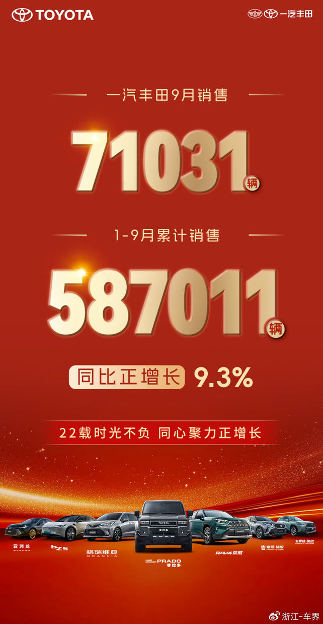 2025年10月1日,一汽丰田率先公布9月销售业绩;9月销售新车71031辆; 1-9月累计销售新车587011辆,同比增长9.3%,正增长定式持续延续。