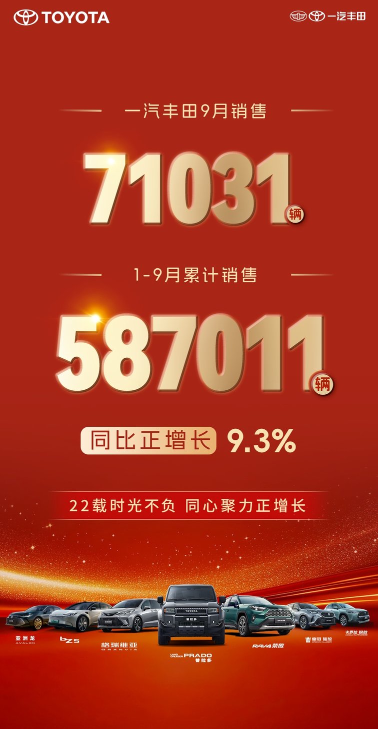 2025年10月1日,一汽丰田率先公布9月销售业绩;9月销售新车71031辆; 1-9月累计销售新车587011辆,同比增长9.3%,正增长定式持续延续。