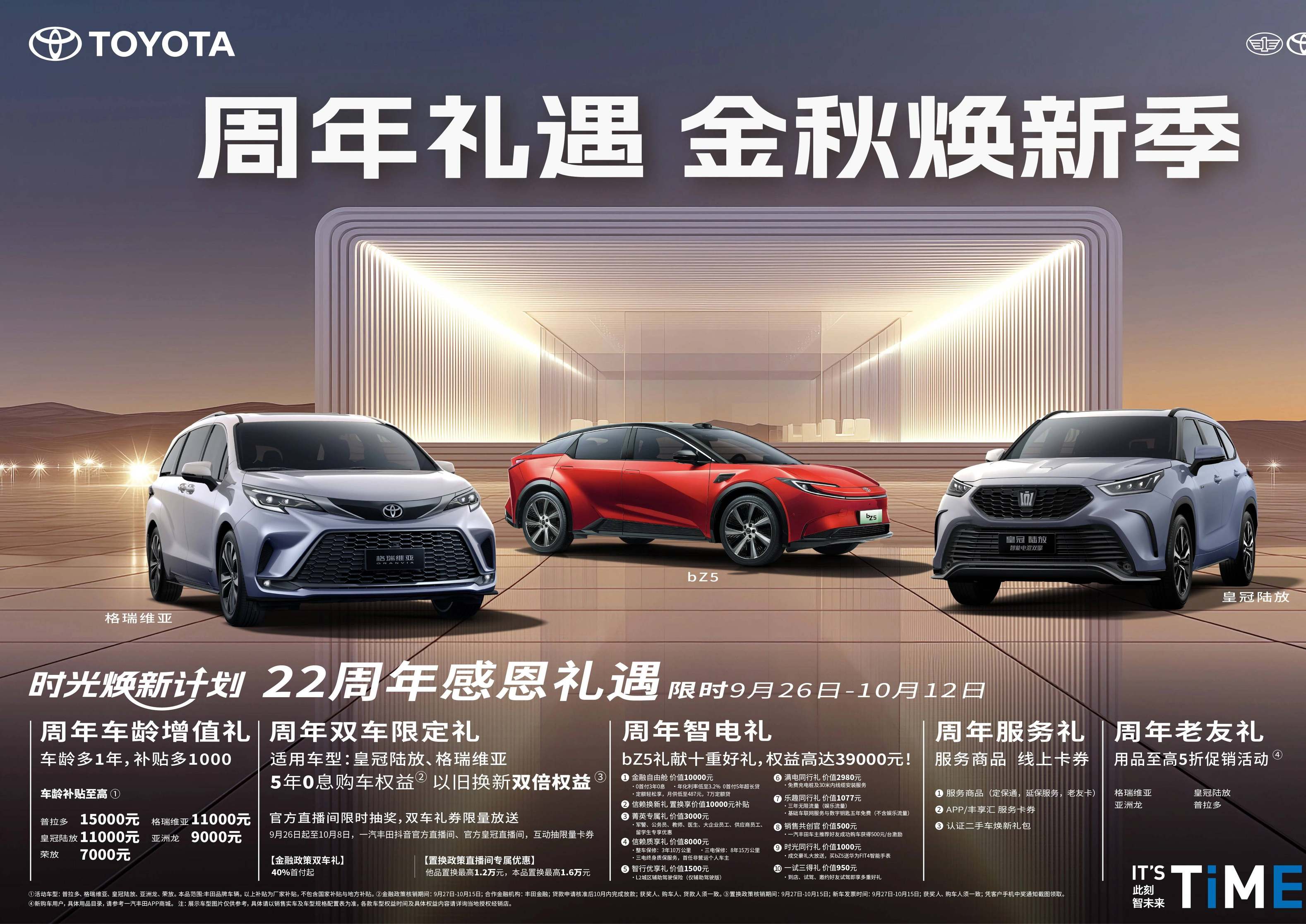 9月是一汽丰田的生日月,22年前,一汽丰田拔锚启航,开启了壮阔的发展篇章。22年间,一汽丰田累计赢得1200万用户的信赖,积累了今天应对产业变革的巨大资产;9月自然也就成了一汽丰田的“客户回馈月”。