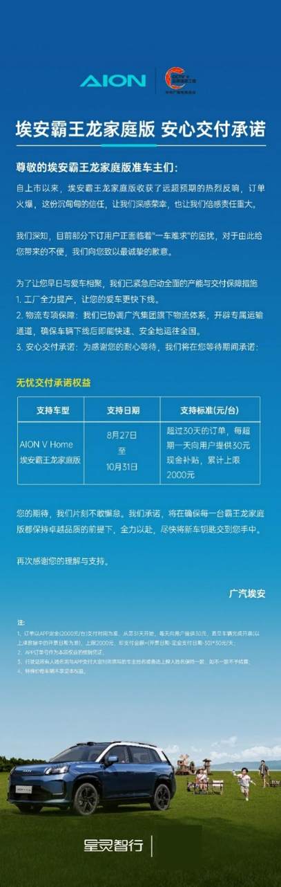 超期补贴!埃安霸王龙家庭版热销加推“安心交付”政策