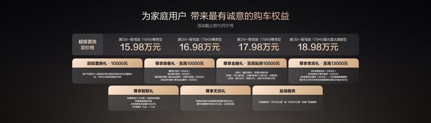 此次,唐DM-i智驾版 175KM长续航版共推出3款车型,售价17.98万~19.98万元(10月31日前完成购车可享10000元置换补贴)。