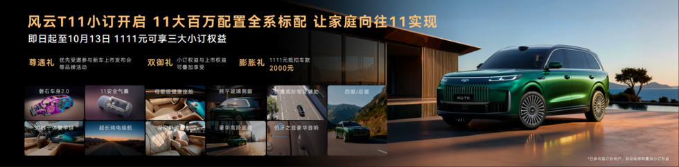 风云T11的小订已经正式开启,即日起至10月13日,只需支付1111元下订,即可尊享三大小订权益: