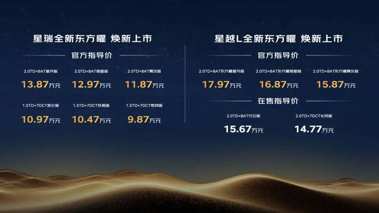 9月30日,吉利中国星全新东方曜系列在2025天津国际车展现场上市,官方指导价9.87万至17.97万元。其中,星瑞全新东方曜焕新2.0TD+8AT与1.5TD+7DCT两种动力组合共六个版本,官方指导价官方指导价9.87万至13.87万元;星越L全新东方曜则焕新三款2.0TD+8AT车型,官方指导价15.87万至17.97万元。