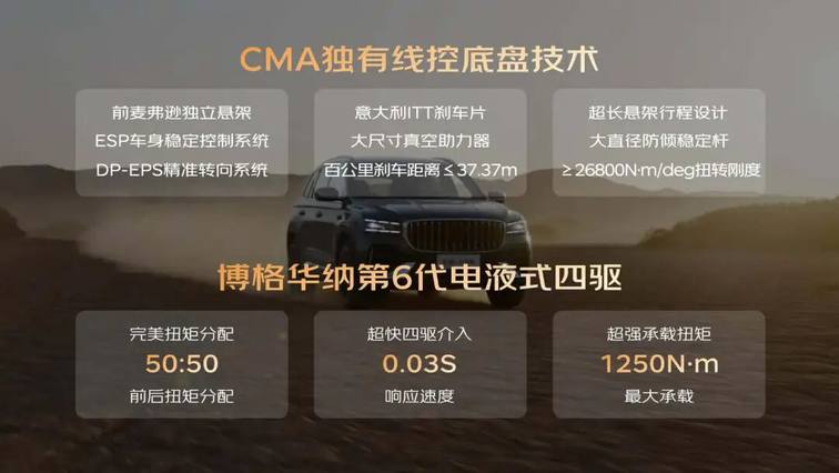 驾控性能上,全新东方曜系列搭载2.0TD高功率大涡轮发动机+爱信8AT黄金动力总成,最大功率200kW,峰值扭矩400N·m,零百加速仅6.5秒,性能提升14%,让高性能,不再只是豪华品牌的专属;基于CMA线控底盘打造,并配备四轮独立悬架、运动负外倾角设计及大直径防倾稳定杆等,使得全新东方曜系列在极致运动与舒适驾乘之间找到完美平衡。更值得一提的是,星越L全新东方曜还将搭载博格华纳第六代电液式四驱系统,0.03秒极速响应,实现50:50扭矩分配,无惧湿滑雨雪,亦可纵情旷野。
