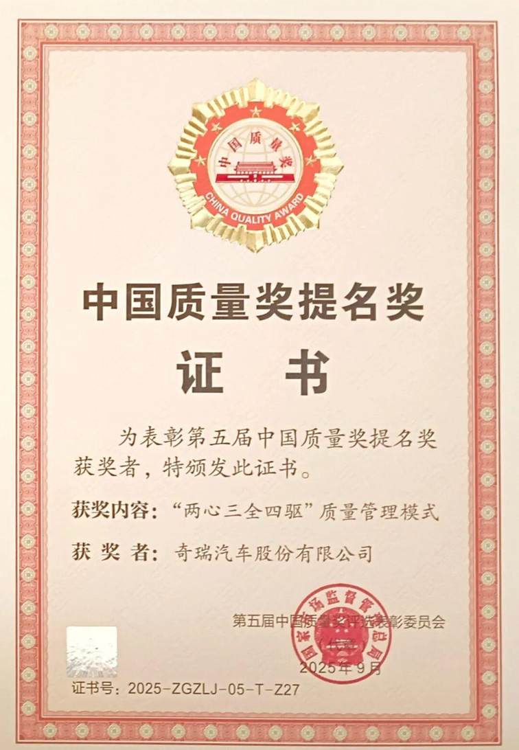 图为奇瑞汽车荣获中国质量奖提名奖