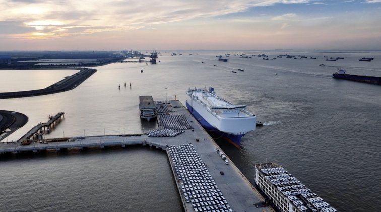 图为上海海通国际汽车码头,奇瑞出口车辆整装待发