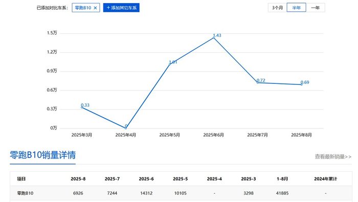根据公开的单车型销量显示,零跑B10上市前的3月销量为3298台,上市当月也就是4月销量没有显示,5月销量10105台,6月销量升至14312台,7月销量下滑到7244台,8月销量低至6926台。从该车销量走势来看,6月销量升至高位后,接下来就开始出现了走低的苗头。