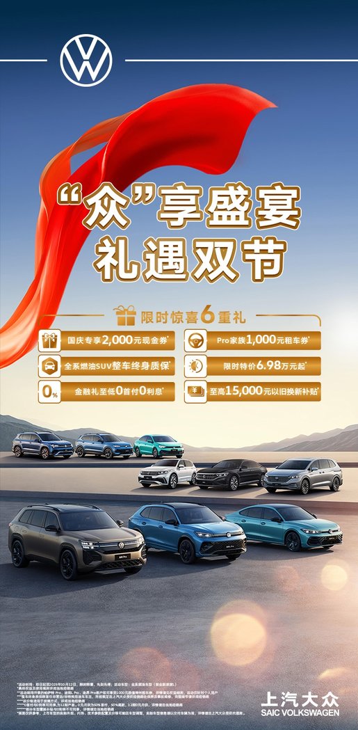 与此同时,赶在金九银十的关键节点,9月底至10月12日,上汽大众带来了更加丰厚的购车礼遇,购买上汽大众旗下途昂家族、帕萨特家族、途观家族、威然、途岳家族及朗逸家族等车型,有机会享受国庆专享2,000元现金券;活动期间购买Pro家族可享1000元租车券,还有全系燃油SUV整车终身质保、限时特价6.98万元起、至高15,000元以旧换新补贴、金融礼至低0首付0利息等等。(具体以实际到店为准)