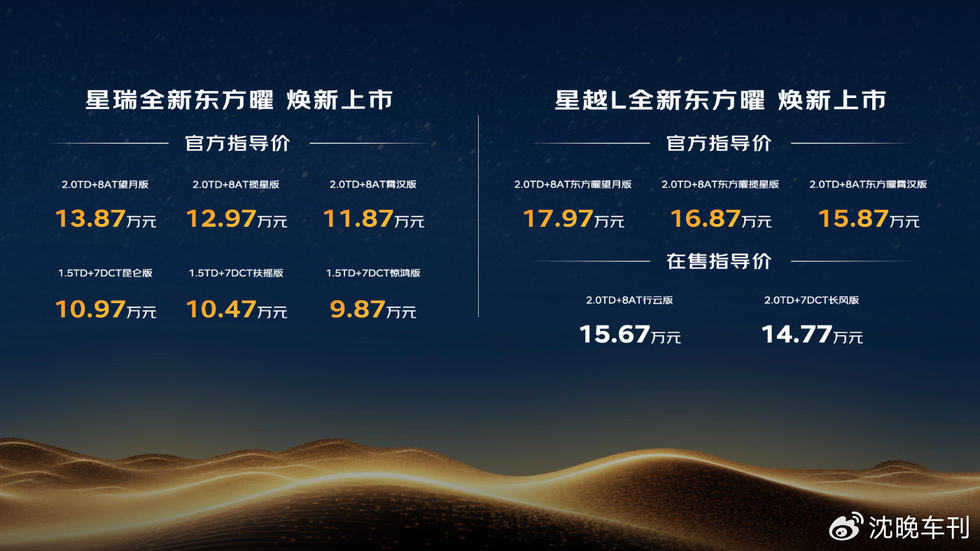 中国星全新东方曜以“中国设计、智能科技、极致驾控、越享舒适、中国式安全”重新定义中国燃油车的价值标准,官方指导价9.87万至17.97万元。其中,星瑞全新东方曜焕新2.0TD+8AT与1.5TD+7DCT两种动力组合共六个版本,官方指导价9.87万至13.87万元;星越L全新东方曜则焕新三款2.0TD+8AT车型,官方指导价15.87万至17.97万元。