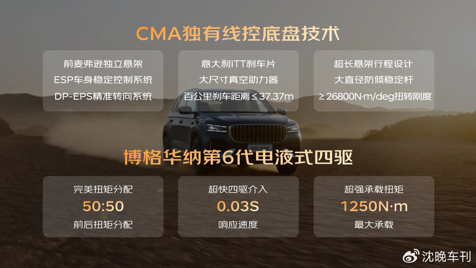 驾控性能上,全新东方曜系列搭载2.0TD高功率大涡轮发动机+爱信8AT黄金动力总成,最大功率200kW,峰值扭矩400N·m,零百加速仅6.5秒,性能提升14%,让高性能,不再只是豪华品牌的专属;基于CMA线控底盘打造,并配备四轮独立悬架、运动负外倾角设计及大直径防倾稳定杆等,使得全新东方曜系列在极致运动与舒适驾乘之间找到完美平衡。更值得一提的是,星越L全新东方曜还将搭载博格华纳第六代电液式四驱系统,0.03秒极速响应,实现50:50扭矩分配,无惧湿滑雨雪,亦可纵情旷野。