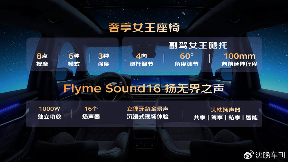 越享舒适上,星越L全新东方曜不仅主驾配备座椅按摩功能,还配备了焕新升级的“奢享女王副驾”,拥有8点座椅按摩,6种模式,3种强度,以及新增4项腿托功能,只需轻触调节,腿托即可向前延伸达100毫米,并支持高达60度的多角度自由调节。轻松实现零重力坐姿。后排靠背支持30°-40°电动无级调节,一键到位,每位乘客皆可从容安坐。而在听觉上,全新东方曜系列搭载由大师级团队专业调校的Flyme Sound 16扬无界之声,12通道精准布局,含同级唯一主驾头枕私密声场,真正实现“移动音乐厅”般的沉浸体验。而豪华麂皮内饰、琉璃溢彩256色氛围灯、高级车载香氛、50W无线快充等细节功能的加入,则让全新东方曜系列更具人性光辉。此外,星越L全新东方曜系列通过AI数字底盘与CCD可变阻尼悬架深度融合,实现了毫秒级动态响应,让底盘学会“思考”,提前预判、主动适应,于颠簸中提炼从容,赋予全家出行的松弛感。
