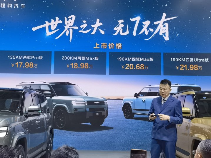 车展现场,方程豹钛7上市,推出4款配置:135KM两驱Pro版、200KM两驱Max版、190KM四驱Max版和190KM四驱Ultra版。价格区间为17.98万元-21.98万元,以超高性价比重塑大五座硬派SUV市场标杆。