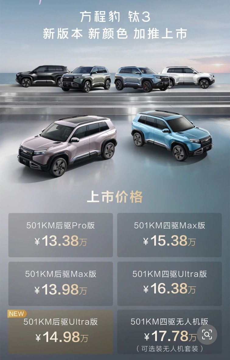 方程豹汽车同时宣布:方程豹钛3加推后驱Ultra版,售价14.98万元。该车新增微光粉、冰晶蓝全新车色,为消费者提供了更多潮流选择。