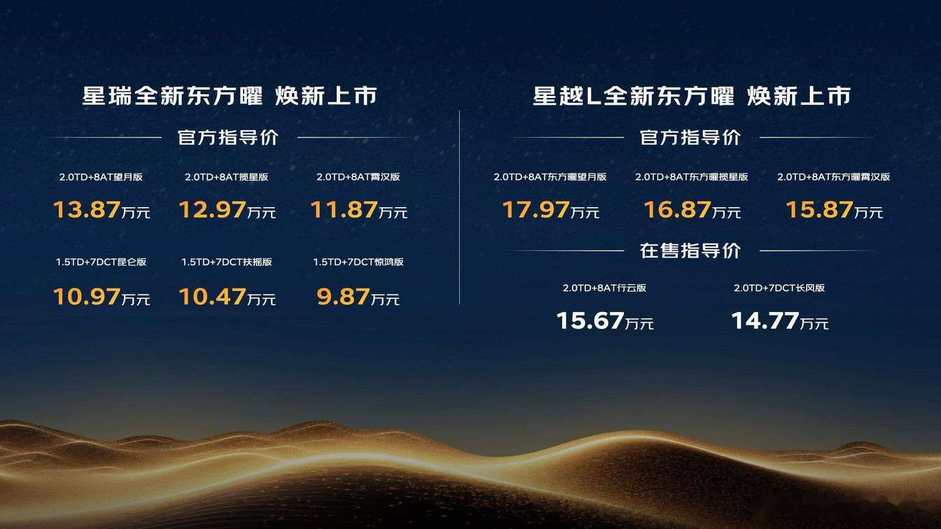 新车以“中国设计、智能科技、极致驾控、越享舒适、中国式安全”五大核心优势,全面革新燃油车价值标准,两款车型组成双旗舰矩阵,覆盖10万-20万元主流价格带,其中,轿车车型全新星瑞东方曜焕新2.0TD+8AT与1.5TD+7DCT两种动力组合,共六个版本,官方指导价9.87万至13.87万元;SUV车型全新星越L东方曜则焕新三款2.0TD+8AT车型,官方指导价15.87万至17.97万元。