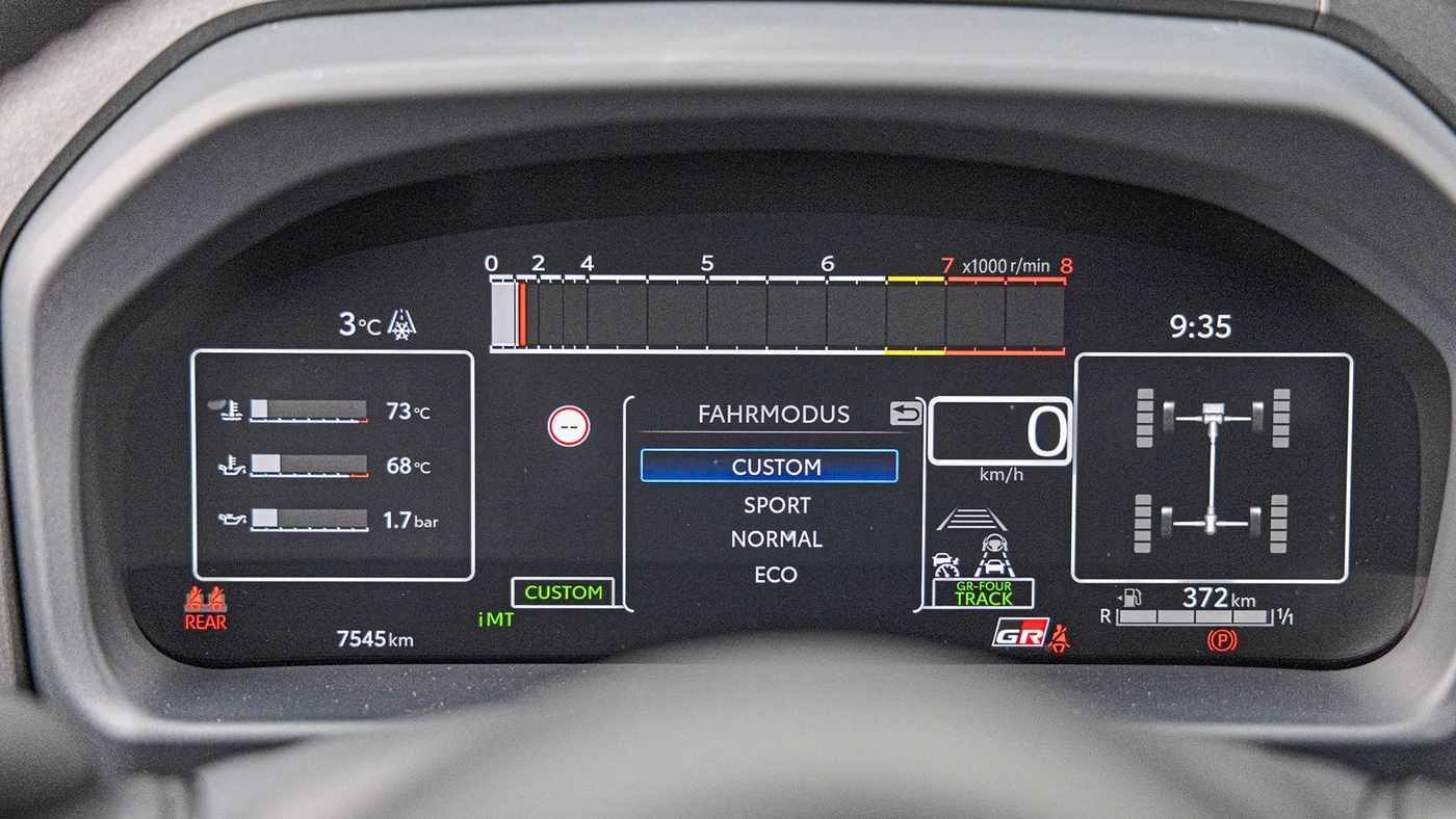 此外,GR YARIS的四轮驱动系统经过了精心调校。与前代的固定比例(30:70、50:50、60:40)不同,第二代提供了更加灵活的动力分配方式,可以根据不同的驾驶模式调整前后轴之间的动力分配比例。