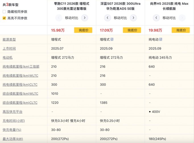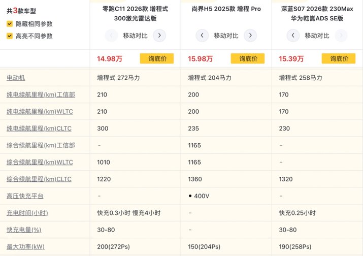 再来看下顶配车型,尚界H5增程MAX版本的纯电续航依旧是235km,深蓝S07增程顶配版的纯电续航虽然达到了300km,但17.39万元的售价要比零跑C11增程顶配版贵1.4万元。