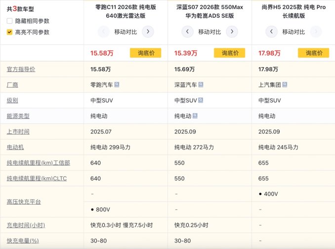 翻看现在的SUV销量榜不难发现,15万元级别算得上是一个热门市场。在这个价位当中,车企可以将产品力做到相对均衡,满足家用的大部分需求。在近期新车市场当中,零跑C11、深蓝S07、尚界H5都算得上是热销车型,大咖今天也对比这三款车型的产品力,看看谁更值得选择。